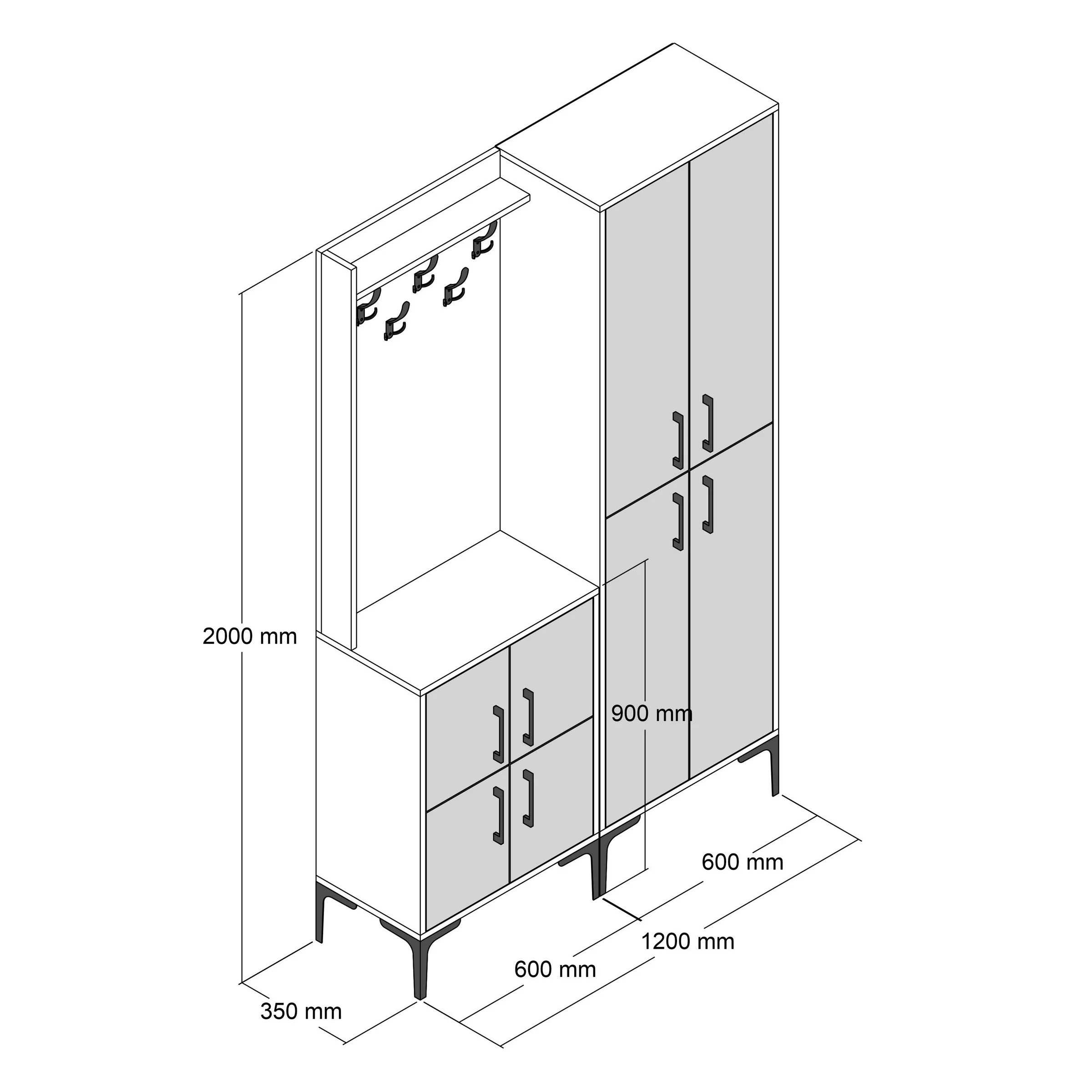 Kabinin toplam genişliği 120 CM, iki parçaya bölünmüş: Genişliğin sol kısmı 60 Sağ da genişliğe sahiptir 60 Sağ.